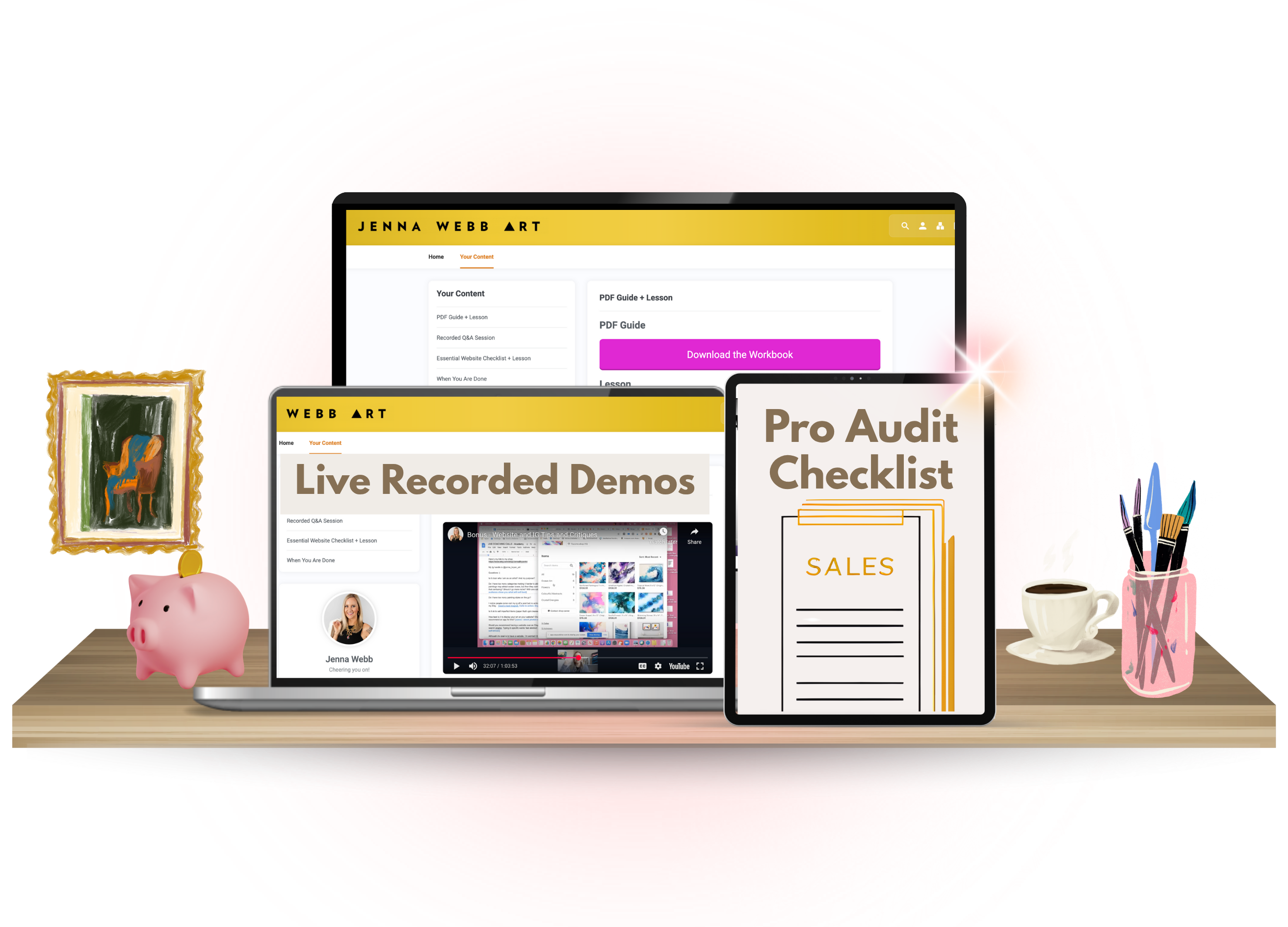 Turn browsers into buyers with a compelling site (even if you're not tech savvy)! You'll learn how to update & analyze your site in the mission-critical areas. Most importantly, you'll get laser focused so you can TOSS the time-wasters that (unknowingly) hold back most artists from success!